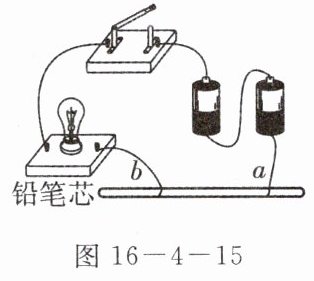 18. 如图16 - 4 - 15所示电路,导线a的一端固定连接在铅笔芯上,当导线b的一端在铅笔芯上左右移动时,灯泡亮暗会发生变化,这个实验说明铅笔芯是_______(选填“导体”或“绝缘体”),还能说明导体的电阻与_______有关. 受此启发,人们制造了一种可以改变电阻的元件,叫做__________.
