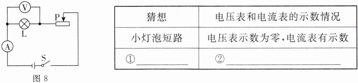 8. 小利按如图8所示电路图连接电路,当开关闭合后,发现小灯泡不亮. 请你根据电路结构猜想出一种原因,仿照下表中的示例写出对应的电压表和电流表的示数情况.