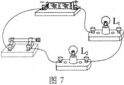 7. 如图7电路中,灯泡L₁、L₂均不亮. 将电压表接在电源两端或L₁两端时,示数均为3 V,改接在L₂两端时示数为0,该电路的故障是______________;如用电压表接在开关两端,示数应为______.