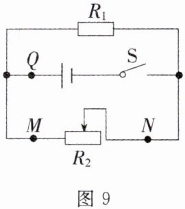 9. 如图9所示电路中,由于接线柱接触不良导致电路发生了断路故障. 若电路中仅有一处故障,且只发生在电阻R₁、R₂上. 现通过接入一个电表来判断故障.