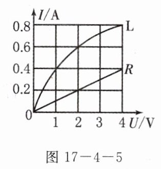 6. 一种电工工具由一个小灯泡L和一个定值电阻R并联而成,通过L、R的电流跟其两端电压的关系如图17 - 4 - 5所示. 由图可得定值电阻R的阻值为______Ω;当把这个工具接在电压为2 V的电路两端,L、R并联的总电阻是______Ω.