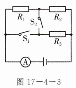 4. 如图17 - 4 - 3所示,电源电压保持不变,电阻R₁=R₂=R₃=10 Ω. 要使R₂、R₃并联,应闭合开关______,此时电流表的示数为I₁;要使R₁、R₂串联,开关S₁、S₂应______(选填“断开”或“闭合”),此时电流表的示数为I₂;则I₁ : I₂=______.