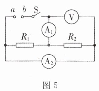 5. 在如图5所示的电路中,电阻$R_1$标有“6 $\Omega$ 1 A”,$R_2$标有“3 $\Omega$ 1.2 A”,电流表$A_1$、$A_2$的量程均为0~3 A,电压表的量程0~15 V. 闭合开关S后,为保证$R_1$、$R_2$均不损坏,则允许的最大电源电压和此时通过电流表$A_1$的电流分别为 ( )