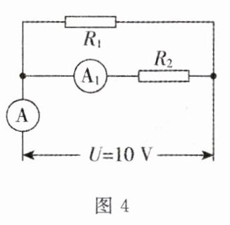 4. 如图4所示,$R_1 = 10\Omega$,电流表$A_1$示数为0.5 A,电源电压为10 V不变. 下列叙述正确的是 ( )