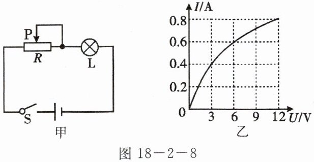 15. 有一种亮度可以调节的小台灯,其电路图如图18 - 2 - 8甲所示. 电源电压为15V,通过灯泡L的电流跟其两端电压的关系如图18 - 2 - 8乙所示,灯泡L的额定电压为12V,则灯泡L的额定功率为__________W;调节滑动变阻器$R$,使灯泡L的功率为3.6W,此时滑动变阻器$R$连入电路的阻值为_______$\Omega$.