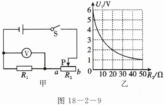 16. 如图18 - 2 - 9甲所示电路,电源电压为6V不变,滑动变阻器的滑片P从$a$端移动到$b$端,定值电阻$R_1$两端的电压随滑动变阻器$R_2$阻值变化的图像如图18 - 2 - 9乙所示.