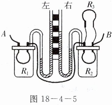 12. 如图18 - 4 - 5是“探究电流通过导体产生热量的影响因素”的实验装置,容器中有等量空气且密闭良好,$R_1 = R_2 = R_3 = 5\ \Omega$,当A、B接入电路时,则( )