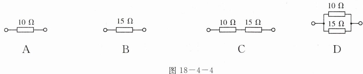 11. 有阻值为$10\ \Omega$、$15\ \Omega$的两根电阻丝,把它们按图18 - 4 - 4中的方式连成电路,先后接入同一电源,在相等时间里放出热量最多的是( )