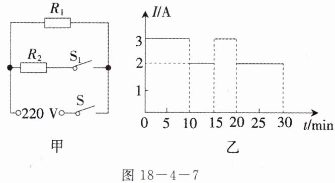 15. 小明的爸爸为爷爷买了一台新型电饭煲,电饭煲有两个加热挡位,其简化电路如图18 - 4 - 7甲所示,电阻丝的阻值$R_1$和$R_2$不变,只闭合S时为低温挡,可以慢煮;再闭合$S_1$时是高温挡,可以快煮. 某天,小明的爷爷将电饭煲接入$220\ V$的家庭电路中,两个挡位交替正常使用$30\ min$,通过电饭煲的总电流$I$随时间$t$变化的图像如图乙所示. 求: