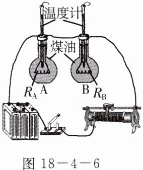 14. 小宇和小华同学为了探究“电流通过导体产生的热量与电阻的关系”,设计了如图18 - 4 - 6所示的实验电路. 两个烧瓶A、B中盛有质量、初温相等的煤油,$R_A$与$R_B$是阻值不同的电热丝.
