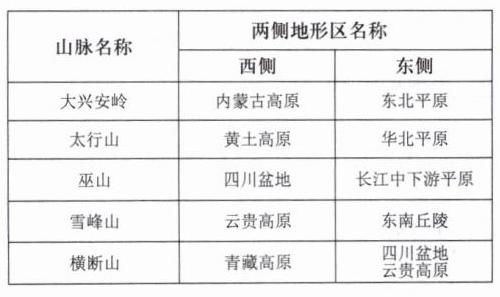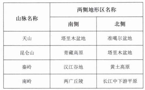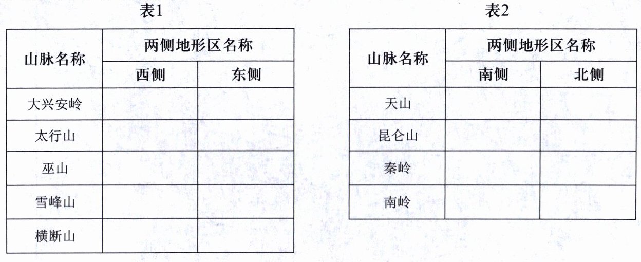 (5)山脉构成我国地形的骨架,它通常是某些地形区的界线。请仿照图中山脉走向及两侧地形区分布示意图,在表1、表2中填出山脉两侧地形区的名称。