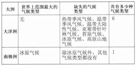 (2)在图中各气候类型中,只分布在大陆东岸,西岸没有的气候类型有______________、_______________、________________;只分布在大陆西岸,东岸没有的气候类型有______________、_______________、________________。