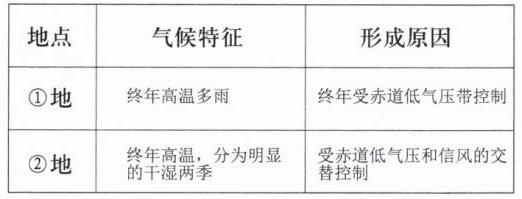 (4)③地:纬度较低,山地海拔高,从山麓到山顶,随着海拔升高,气温降低,降水变化,形成丰富的垂直气候带,从而形成植被的垂直变化现象。④地:地处低纬度,太阳辐射强,全年气温高,位于东南信风迎风海岸,容易形成地形雨,沿岸有暖流流经,增温加湿作用明显,降水丰沛,形成热带雨林。