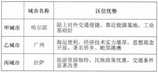 (5)从社会经济方面,简要分析甲、乙、丙三城市对外开放区位优势的主要差异并填在下表中。