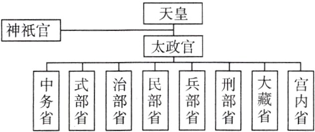 (3)地位:天皇是最高统治者。目标:废除了官职的世袭陋习,建立了以天皇为中心的中央集权制。