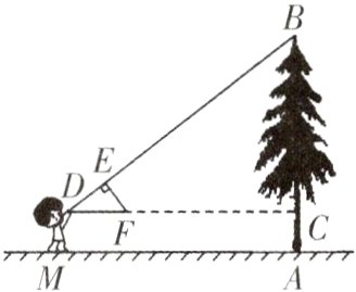 4.如图,小明用自制的直角三角形纸板DEF测量树的高度AB.他调整自己的位置,设法使斜边DF保持水平,并且边DE与点B在同一直线上,已知纸板的两条直角边DE = 40 cm,EF = 30 cm,测得边DF离地面的高度AC = 1.5 m,CD = 10 m,求树高AB.