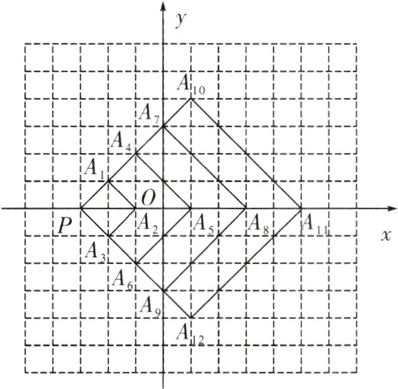 2.【几何直观、推理能力】(2023·烟台)如图,在直角坐标系中,每个网格小正方形的边长均为1个单位长度,以点$P$为位似中心作正方形$PA_{1}A_{2}A_{3}$,正方形$PA_{4}A_{5}A_{6}$,…,按此规律作下去,所作正方形的顶点均在格点上,其中正方形$PA_{1}A_{2}A_{3}$的顶点坐标分别为$P(-3,0)$,$A_{1}(-2,1)$,$A_{2}(-1,0)$,$A_{3}(-2,-1)$,则顶点$A_{100}$的坐标为( )