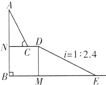 9.(2024·南阳市镇平县模拟)2024年春节前夕,哈尔滨旅游市场的火热带动了全国“冰雪旅游”的繁荣,某地准备依山建设一个滑雪场带动本地旅游的发展.如图,小山AB的山腰CN上有一个平台CD长为45 m,从点C看山顶A的仰角为63°,山坡DE的坡度为i=1∶2.4,该地准备利用斜坡DE建设一个滑雪场,且DE的长度为390 m,若点D到地面BE的垂线段与BN构成的四边形恰好为正方形时,且图中各点均在一个平面内,求小山AB的高度.(精确到整数,参考数据:sin63°≈0.89,cos63°≈0.45,tan63°≈1.96)