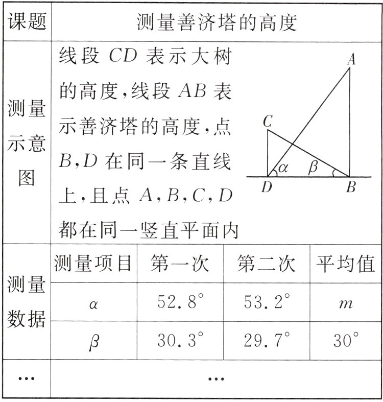 6.天王寺善济塔位于河南省新乡市,修建于元朝至元四年(1267),为七级六角形砖塔,该塔是第七批全国重点文物保护单位.某校数学“综合与实践”小组的同学把“测量善济塔的高度”作为一项课题活动,他们制订了测量方案,并利用课余时间完成了实地测量.他们在善济塔前的一棵树底部D处测得塔顶A处的仰角为α,在塔底部B处测得大树顶部C处的仰角为β,测得树高CD为10 m.为了减小测量误差,小组在测量两个仰角的度数时,都分别测量了两次并取它们的平均值作为测量结果,测量数据如下表(不完整).