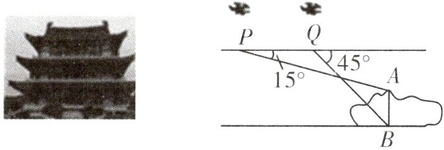 13.(2023·张家界)“游张家界山水,逛七十二奇楼”成为今年旅游新特色.某数学兴趣小组用无人机测量奇楼AB的高度,测量方案如图:先将无人机垂直上升至距水平地面225 m的P点,测得奇楼顶端A的俯角为15°,再将无人机沿水平方向飞行200 m到达点Q,测得奇楼底端B的俯角为45°,求奇楼AB的高度.(结果精确到1 m,参考数据:sin 15°≈0.26,cos 15°≈0.97,tan 15°≈0.27)