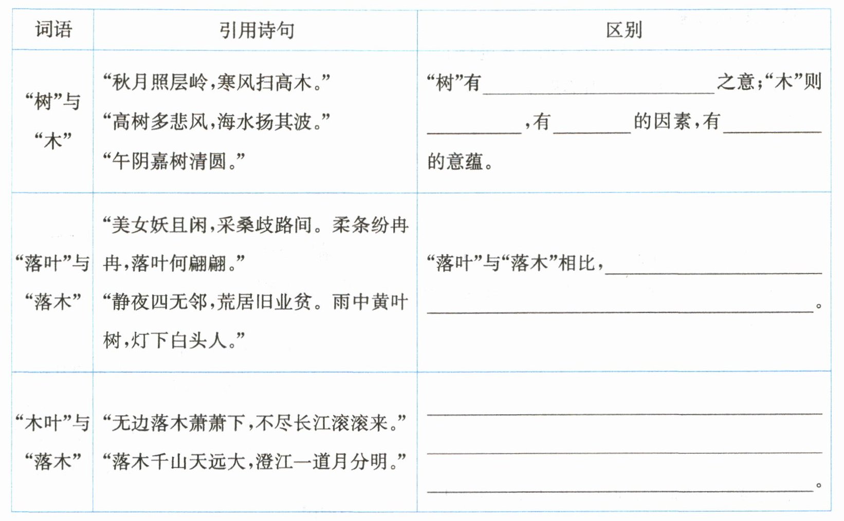 2.结合文中引用的诗句,分析“树”与“木”“落叶”与“落木”、“木叶”与“落木”的区别,完成下表。