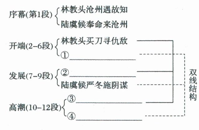 (2)本文采用了双线结构形式,明线是林冲被逼上梁山,暗线是陆虞候设计陷害林冲。请采用章回体小说的回目形式概括横线处相应的情节。