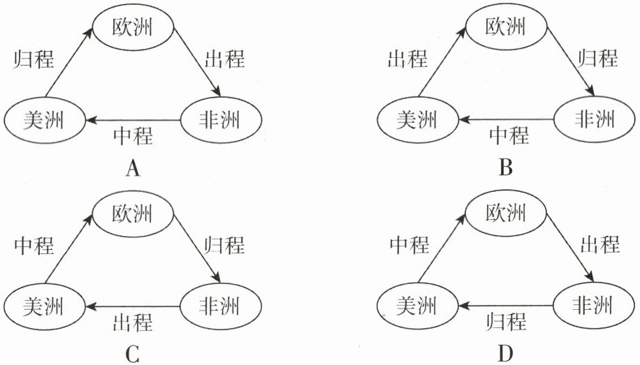 16. 17世纪,以贩卖黑奴为中心的贸易被称为“三角贸易”。下列示意图能正确表示“三角贸易”航程路线的是 ( )