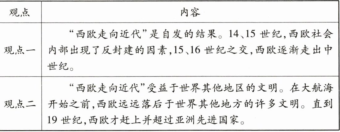 示例:赞同观点一,“西欧走向近代”是自发的结果。14、15世纪,西欧社会内部出现了反封建的因素,封君封臣制度和庄园制度趋向瓦解,手工工场和租地农场的出现,促进了西欧经济和社会的发展。随着资本主义工商业的发展,14世纪中叶欧洲出现文艺复兴运动,文艺复兴是资本主义经济发展在精神文化领域的反映,极大地促进了人们的思想解放,推动了资本主义经济和政治的发展。15世纪后,新航路的开辟以及欧洲殖民者在美洲、亚洲和非洲的殖民掠夺,促进了资本主义的发展,打破了世界各地区相对隔绝的状态,为世界市场的形成创造了重要的条件。15、16世纪之交,西欧逐渐走出中世纪,走向近代。