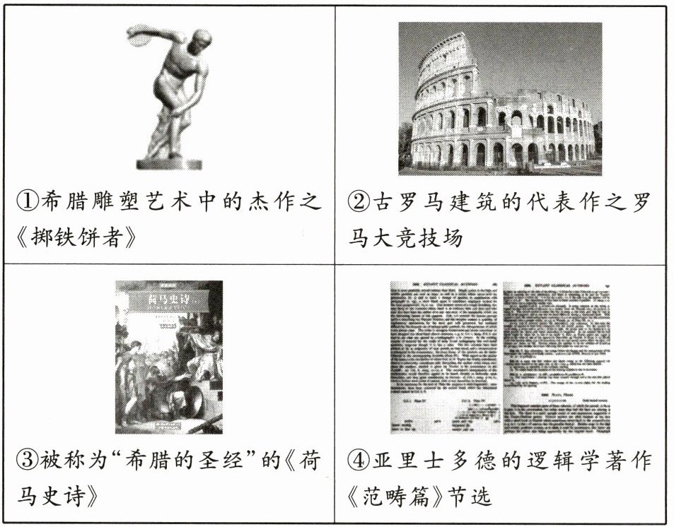 (1)希腊罗马的古典文化体现在神话、文学、艺术、哲学、法学、体育等各个方面。(4分)
