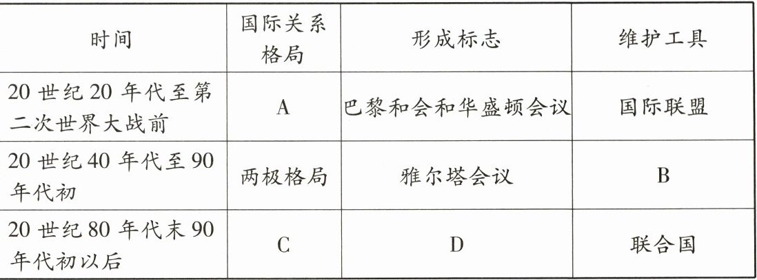 (1)A:凡尔赛—华盛顿体系 B:联合国 C:多极化趋势发展 D:东欧剧变、苏联解体。和平与安全。