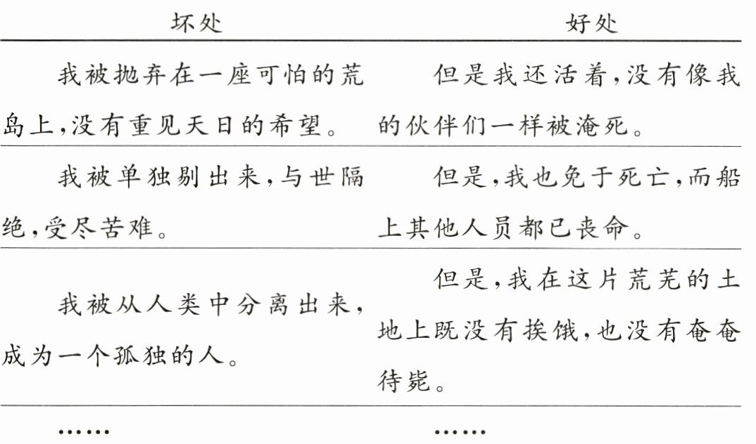 我现在开始认真考虑我的处境。我一一记下我经历的事情,并不是想把自身的遭遇传给后人看,而是要把一直萦系在我心头、不断折磨着我的想法吐露出来。我的理智现在已经逐渐能够控制我的沮丧心情,我开始尽可能地安慰自己,把我遇到的凶险和幸运作个对比,使自己能够心平气和。我按照商业簿记中借方和贷方的格式,如实记录了我所遇到的幸与不幸: