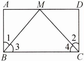 (2)证明:$\because$四边形$ABCD$为平行四边形,$\therefore AB// DC$,$AB = DC$.$\therefore\angle A+\angle D = 180^{\circ}$.在$\triangle ABM$和$DCM$中,$\begin{cases}AB = DC,\\\angle1=\angle2,\\BM = CM,\end{cases}$ $\therefore\triangle ABM\cong DCM(SAS)$.$\therefore\angle A=\angle D = 90^{\circ}$.$\therefore\square ABCD$为矩形.
