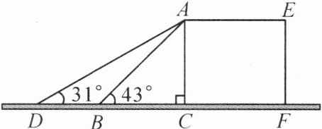 6.(2023 - 2024·盘州期中)某超市利用一个带斜坡的平台装卸货物,其纵断面ACFE如图所示,AE为台面,AC垂直于地面,AB表示平台前方的斜坡,斜坡的坡角∠ABC为43°,坡长AB为2m. 为保障安全,又便于装卸货物,决定减小斜坡AB的坡角,AD是改造后的斜坡(点D在直线BC上),坡角∠ADC为31°,求斜坡AD底端D与平台的距离CD.(结果精确到0.1m,参考数据:sin43°≈0.68,cos43°≈0.73,tan43°≈0.93,sin31°≈0.52,cos31°≈0.86,tan31°≈0.60)