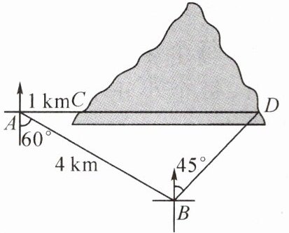 3.(铜仁期末)如图,某施工方计划把一座山的C,D两点用隧道打通,并利用北斗卫星定位技术确定A,C,D三点在东西方向的同一条直线上. 在隧道没有打通之前,技术监督员李工每天需要驾车先从隧道口点C向正西行驶1km到达点A,然后再沿南偏东60°方向行驶4km到达点B,接着再沿北偏东45°方向行驶一段路程才能到达隧道口点D,则隧道CD的长度为________km.