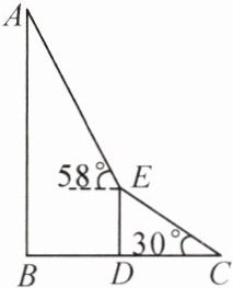 3. 某数学兴趣小组利用所学的知识测量贵州民族文化宫的高度,借助无人机设计了如下测量方案:如图,在点C处,测得C处到文化宫底部B处的水平距离为115.7 m,∠ECD = 30°,无人机沿着CE方向飞行76 m到达E处,此时测得文化宫顶部A处的仰角为58°. 已知DE⊥BC于点D,点A,B,C,D,E均在同一平面内.