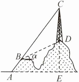 6.(2023·泰州中考)如图,堤坝$AB$长为$10\ m$,坡度$i$为$1:0.75$,底端$A$在地面上,堤坝与对面的山之间有一深沟,山顶$D$处立有高$20\ m$的铁塔$CD$. 小明欲测量山高$DE$,他在$A$处看到铁塔顶端$C$刚好在视线$AB$上,又在坝顶$B$处测得塔底$D$的仰角$\alpha$为$26^{\circ}35'$. 求堤坝高及山高$DE$.(小明身高忽略不计,结果精确到$1\ m$,参考数据:$\sin26^{\circ}35'\approx0.45$,$\cos26^{\circ}35'\approx0.89$,$\tan26^{\circ}35'\approx0.50$)