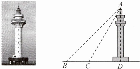 5.(2023·日照中考)日照灯塔是日照海滨港口城市的标志性建筑之一,主要为日照近海及进出日照港的船舶提供导航服务. 数学小组的同学要测量灯塔的高度,如图,在点$B$处测得灯塔最高点$A$的仰角$\angle ABD = 45^{\circ}$,再沿$BD$方向前进至$C$处测得灯塔最高点$A$的仰角$\angle ACD = 60^{\circ}$,$BC = 15.3\ m$,则灯塔的高度$AD$大约是(结果精确到$1\ m$,参考数据:$\sqrt{2}\approx1.41$,$\sqrt{3}\approx1.73$)( )