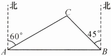 解:过点C作CD⊥AB于点D,则∠ADC = ∠BDC = 90°. 由题意,得AB = 40×2 = 80(km),∠CAD = 90° - 60° = 30°,∠CBD = 90° - 45° = 45°,