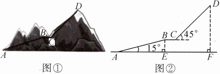 14.(2023·贵州中考)贵州旅游资源丰富. 某景区为给游客提供更好的游览体验,拟在如图①景区内修建观光索道. 设计示意图如图②所示,以山脚$A$为起点,沿途修建$AB$,$CD$两段长度相等的观光索道,最终到达山顶$D$处,中途设计了一段与$AF$平行的观光平台$BC$为$50\ \text{m}$. 索道$AB$与$AF$的夹角为$15^{\circ}$,$CD$与水平线夹角为$45^{\circ}$,$A$,$B$两处的水平距离$AE$为$576\ \text{m}$,$DF \perp AF$,垂足为$F$.(图中所有点都在同一平面内,点$A$,$E$,$F$在同一水平线上)