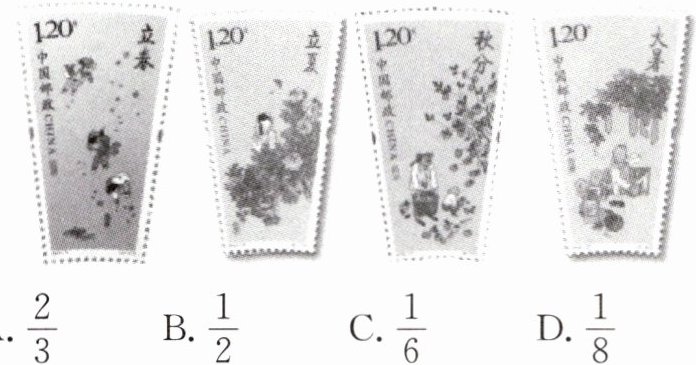 2.(2023·贵阳模拟)小文购买了“二十四节气”主题邮票,他要将“立春”“立夏”“秋分”“大暑”四张邮票中的两张送给好朋友小乐. 小文将它们背面朝上放在桌面上(邮票背面完全相同),让小乐从中随机抽取一张(不放回),再从中随机抽取一张,则小乐抽到的两张邮票恰好是“立春”和“立夏”的概率是( )