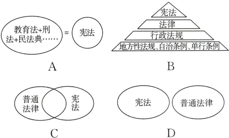 5宪法是国家的根本法,是治国安邦的总章程,是其他法律的立法基础和立法依据。关于宪法和普通法律的关系,下列图示正确的是
