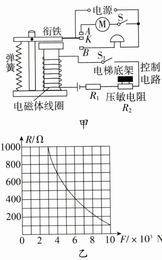 19. (10 分)电梯为居民的出入带来很大的便利,出于安全考虑,电梯都设置了超载自动报警系统,其工作原理如图甲所示。系统电路由工作电路和控制电路组成:当电梯没有超载时,工作电路中的动触点 K 与静触点 A 接触,闭合开关 S,电动机正常工作;当电梯超载时,工作电路中的动触点 K 与静触点 B 接触,电铃发出报警铃声,即使闭合开关 S,电动机也不工作。当控制电路中的电磁铁线圈中的电流达到 20mA 时,动触点 K 刚好接触静触点 B,电铃发出警报声。已知电梯自重为 3×10³N,控制电路中的电源电压 U = 6V,保护电阻 R₁ = 200Ω,压敏电阻 R₂的阻值随压力 F 大小变化如图乙所示。若 g 取 10N/kg,电磁铁线圈的阻值忽略不计。求: