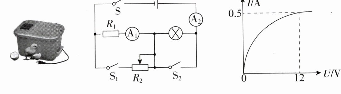 20. (12 分)如图是一种小鸡孵化器,其电路如图所示,在一般情况下,只需灯光照明,灯泡的额定电压为 12V,温度较低时,则需要加热,电源电压为 72V,R₁为定值电阻,R₂为阻值可变的发热电阻丝(标有“200Ω 3A”的字样),电流表 A₁的量程为 0 ~ 0.6A,电流表 A₂的量程为 0 ~ 3A,通过灯泡的电流与灯泡两端的电压关系如图所示,仅闭合 S 时,灯泡恰好正常发光,求: