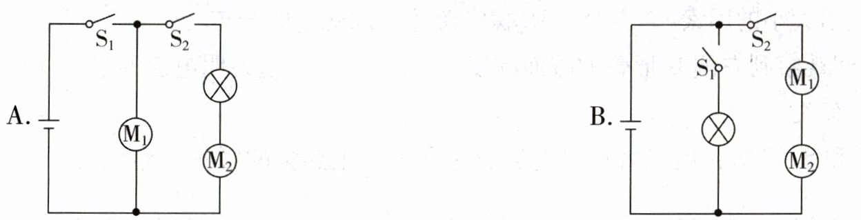 5. 家庭厨房抽油烟机主要由抽风系统和照明灯组成,它们既能同时工作,又能分别独立工作,抽风系统又分为强风(M₁)和弱风(M₂),某同学设计了该油烟机的简化电路图,其中合理的是 ( )