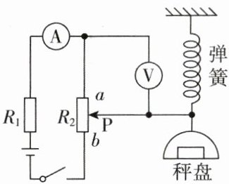 8. 如图是利用电路测量托盘中物体重力的小仪器,其中R₁是定值电阻,R₂是粗细均匀的电阻丝,当托盘上不放任何重物时,滑片P恰好处于a端,则下列说法正确的是 ( )