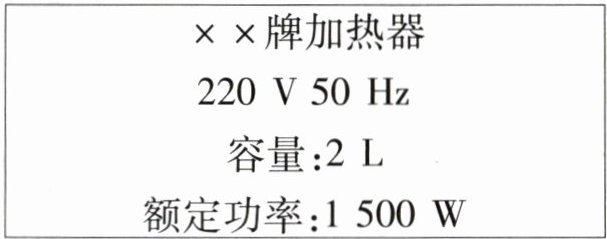 (2)由$P = \frac{W}{t}$可知,热水器消耗的电能:$W = Pt = 1500\text{ W}\times8\times60\text{ s}=7.2\times10^{5}\text{ J}$,该热水器烧水的效率:$\eta=\frac{Q_{吸}}{W}=\frac{6.3\times10^{5}\text{ J}}{7.2\times10^{5}\text{ J}} = 87.5\%$。