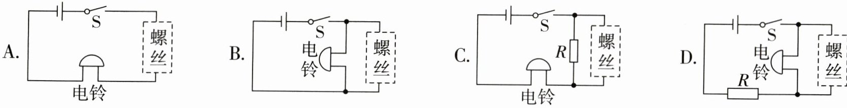 4. 高铁轨道中的螺丝会因震动而松动,检修工作非常艰苦,为解决这一问题,科技创新小组设计了“5G高铁轨道螺丝警报器”。其科学原理是螺丝(电阻不计)连接在电路中,当螺丝松动时,它会与下端导线断开,此时电铃发出警报,及时提醒工人修理。下列符合题意的电路图是 ( )