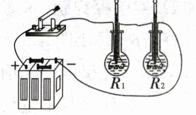 11. 如图所示是探究“影响电流热效应因素”的实验装置,将R₁、R₂两电阻丝密封在两个完全相同的烧瓶内,且R₁>R₂,瓶内装入等质量的煤油,下列说法正确的是 ( )