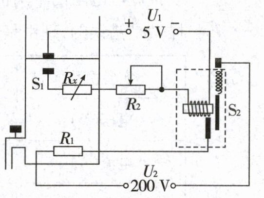 12.如图所示的是某饮水器的原理图。饮水器的容器内装有密封绝缘的电热丝R₁和热敏电阻Rₓ,当水面到达如图所示的位置,接触到开关S₁导通。继电器开关S₂的作用是当饮水器内的水加热至93℃后能自动切断加热电路。以下关于该饮水器工作原理的说法正确的是 ( )