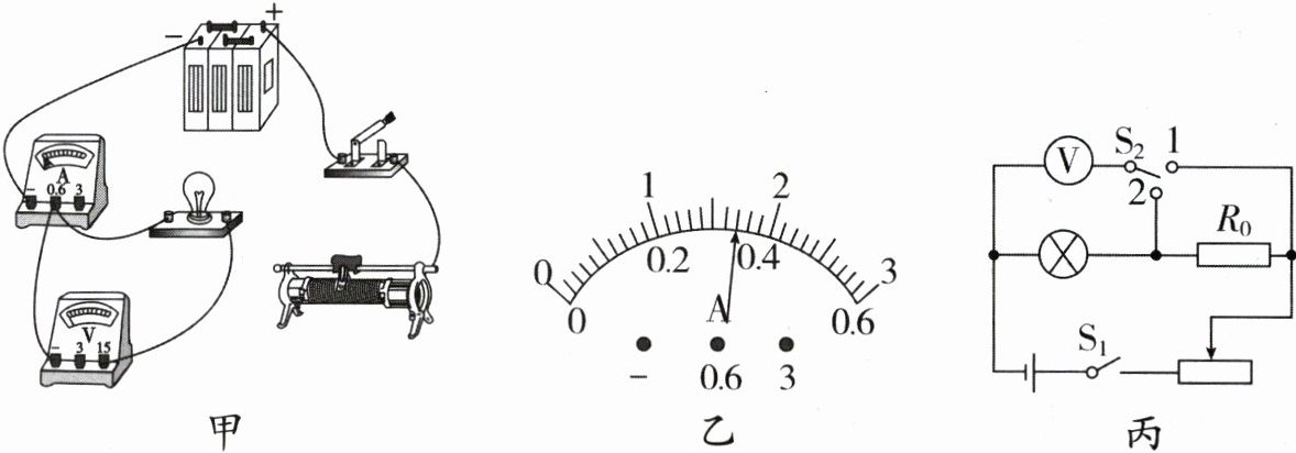 (4)完成上述实验后,小刚向老师要了一个已知阻值为R₀的定值电阻和一个单刀双掷开关,借助部分现有的实验器材,在没有使用电流表的情况下,设计了如图丙所示的实验电路,测出了小灯泡的额定功率,请你帮她完成下列实验步骤: